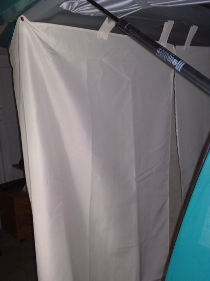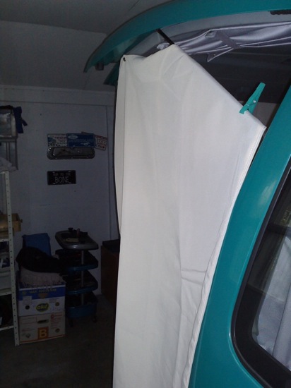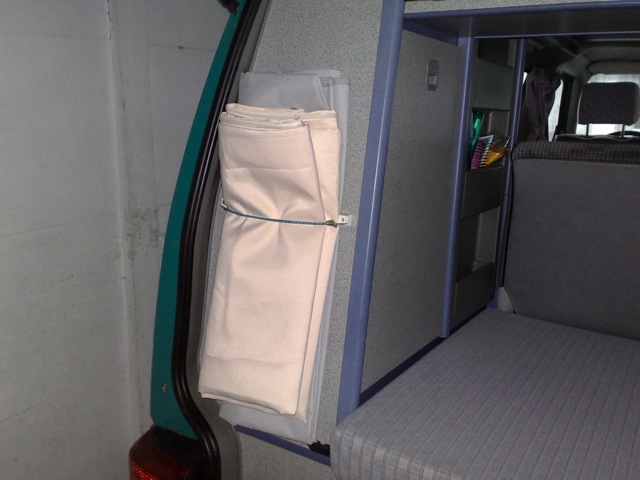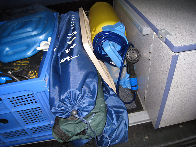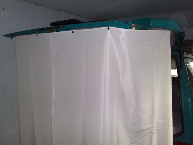 Installation d'une tente de douche sous le hayon. L'espace est suffisant et l'intimité assurée.